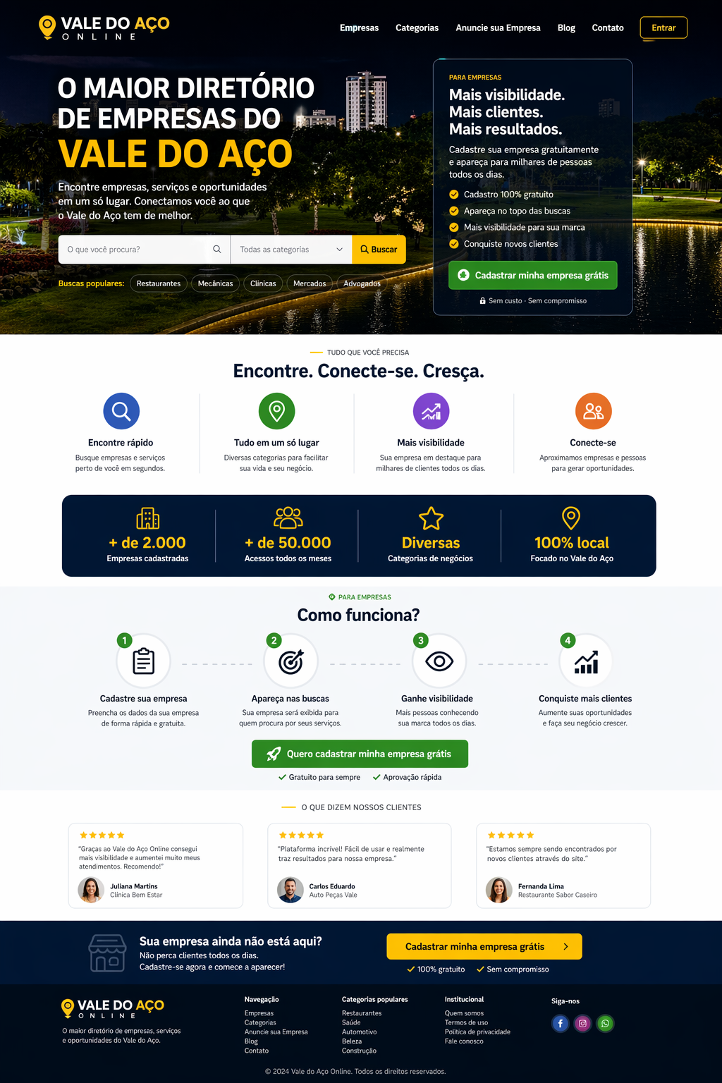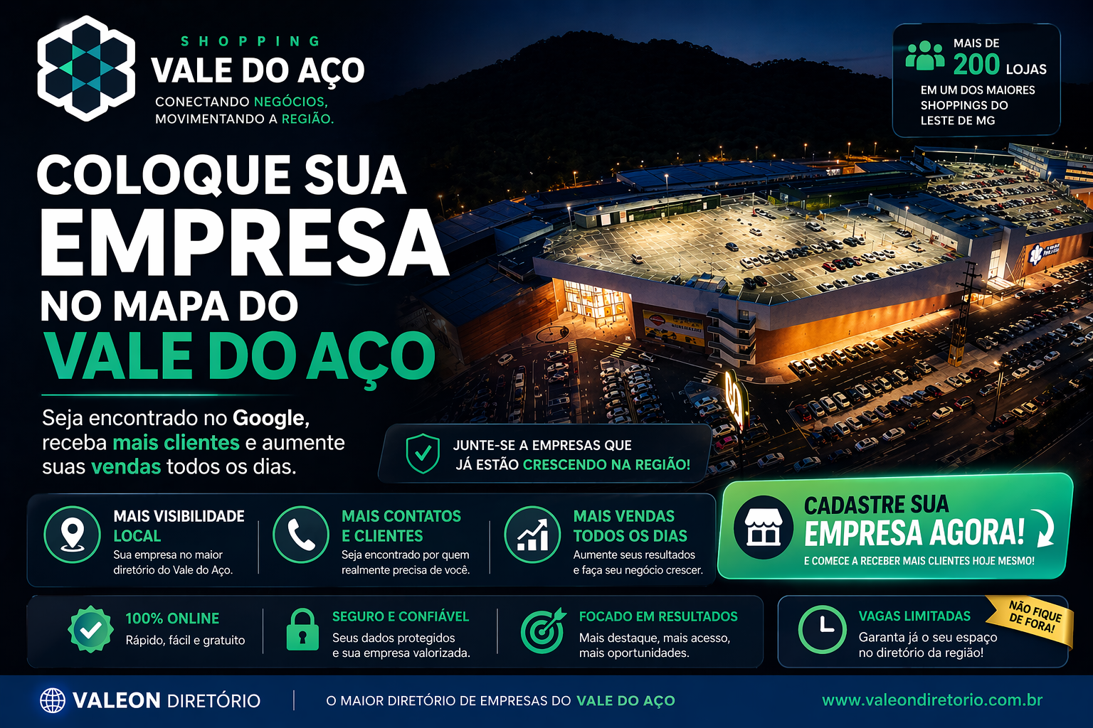 Visite o novo site MAPA DO SITE Próxima página Quem Somos Serviços Ipatinga Comércio Valeon Notícias Cidades do Vale do Aço Eventos Botecando Empreendo no Vale do Aço Curta Músicas VISITE O SHOPPING VALE DO AÇO ENTRE EM CONTATO Envie a sua mensagem Nome E-mail Mensagem Enviar Compartilhe com sua rede!